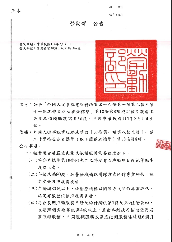 「外國人從事就業服務法第四十六條第一項第八款至第十一款工作資格及審查標準」第18條第8項規定被看護者之失能及依賴照護需要程度,並自中華民國114年8月1日生效。