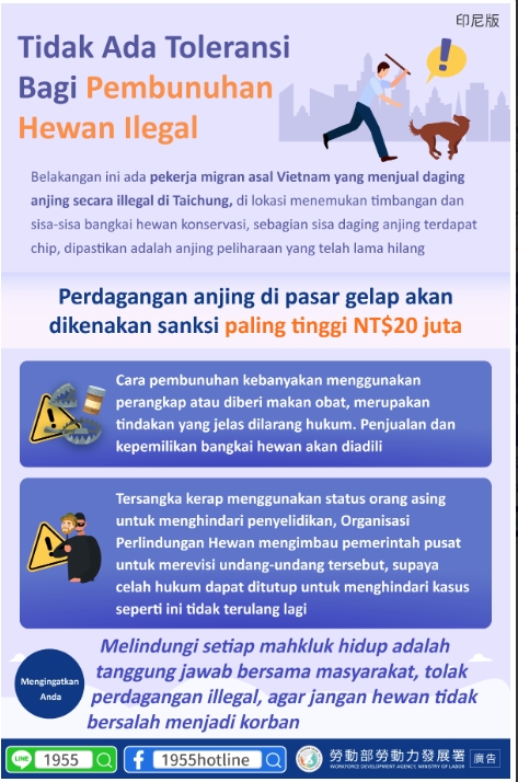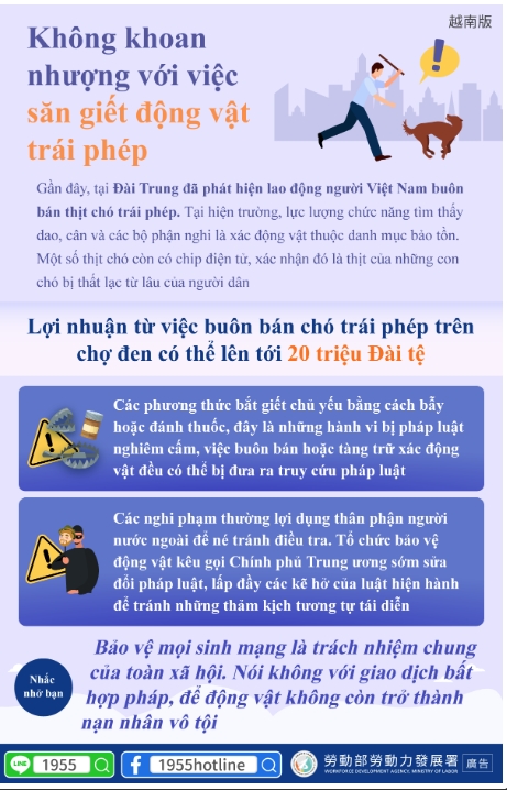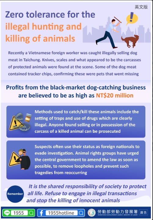 近期在臺中查獲越南籍移工非法販售狗肉,現場發現刀械磅秤及疑似保育類動物遺骸,部分狗肉帶有晶片,確認是民眾走失多時的愛犬